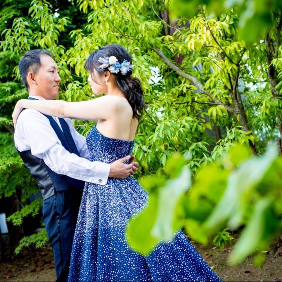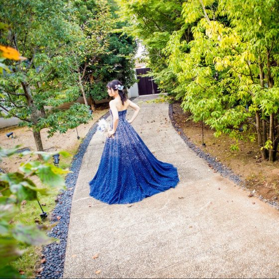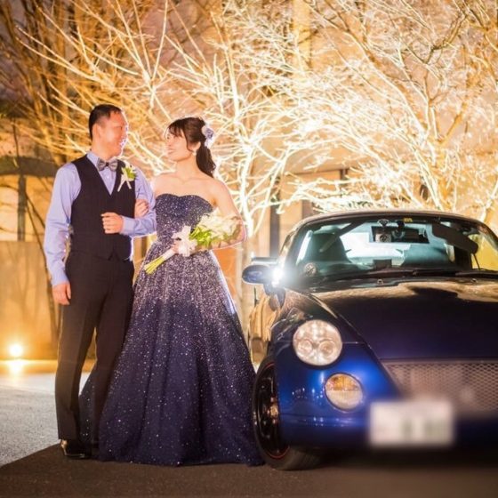 ①2人の大好きなブルーをテーマカラーにし、愛車の紺色のオープンカーでゲストをお迎えした他、お色直し後はブルーのワイシャツ・紺色のドレスにし、会場のテーブルクロス・ナプキン・席札を紺や青・水色にまとめたこと
