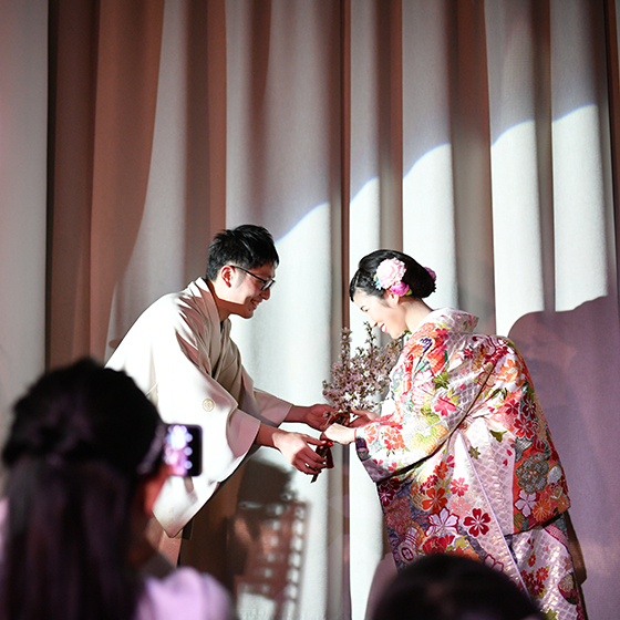 ブーケブートニアのセレモニーでは季節に合わせて桜を使用しました。