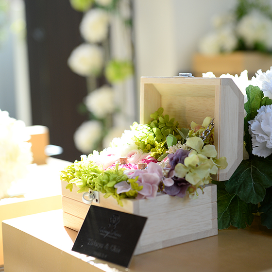 フラワーシャワーの代わりにスター×リボンシャワーにしてみたり、プリザーブドフラワー教室でブーケを作ったりもしました。