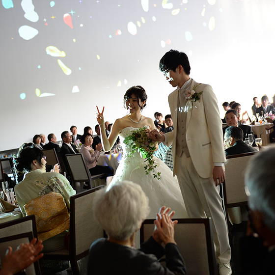①演出:披露宴の入場は本来の扉からではなく、前方一面でプロジェクションマッピングを使用し、カーテンオープンに併せて、テラスから音楽に合わせて登場しました。