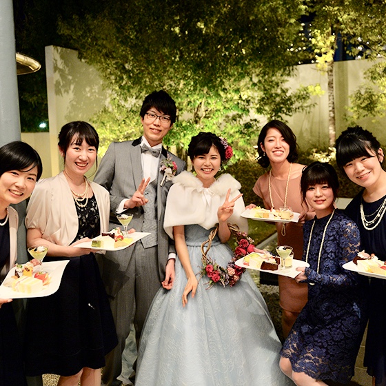 他にも【ブーケブートニア】というセレモニーを取り入れてみたり、デザートビュッフェもサプライズで演出し、フィナーレはミュージカルの最後のように全スタッフと手をつないでお開き...