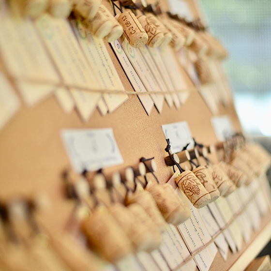 ④アイテム:料理メニュー・席次表・新郎新婦紹介を1冊にまとめたい!また装飾に協力していただいた方々の作品を残したい!と思い、自分達で手作りしました。また、席札の他にコルクを使ったエスコートタグを作成し、ゲストへのメッセージを書きました。