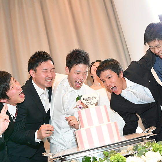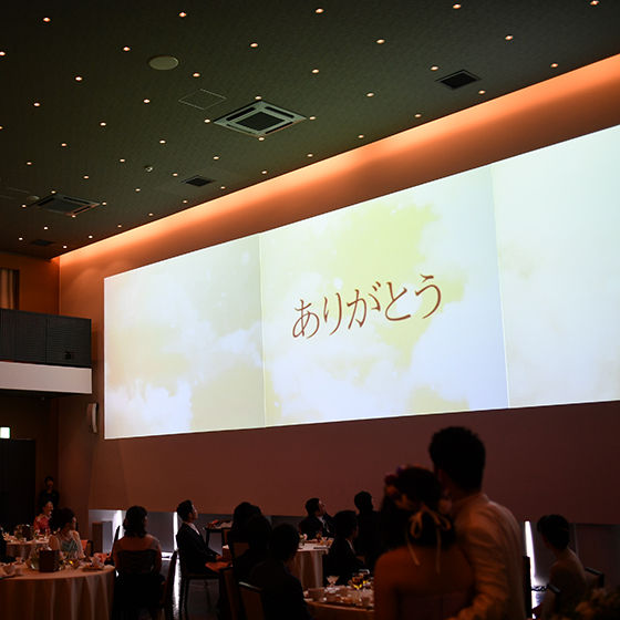新郎新婦とゲストの動線が被らないようになっていたので、準備中やペアレントタイムにゲストと鉢合わせになってしまう等といった心配もなく、いろいろなところからゲストを驚かせる演出もできて楽しかったです。大画面を使ったプロジェクションマッピングからの登場はとても好評でした!!!