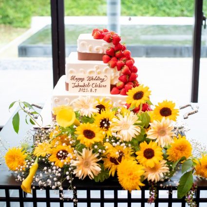 また、真夏ということもあり、こってりよりもさっぱりと爽快感のある味付けにするなど細部にもこだわりました。演出では、明るく華やかで暖かいイメージのある色合いで、私たちの結婚式のテーマや将来の家族像を描くように黄色、白、緑、オレンジをメインとした装花を選びました。