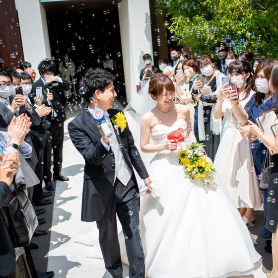 貝殻のブーケを持ち、バブルシャワーとともに登場した披露宴前半は海の世界観で。