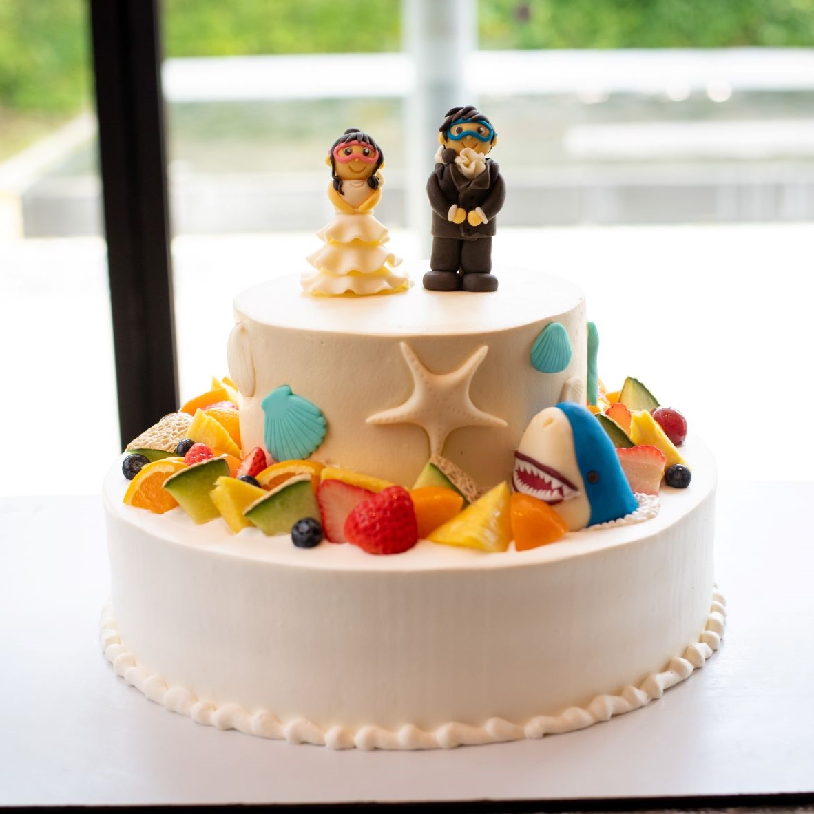 ウエディングケーキは私たちのダイバー姿、そして大好きなサメを取り入れました。