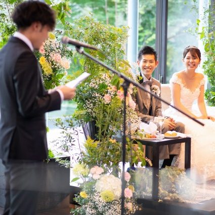 ブライダルフェアで1件目に麗風さんに伺いました。その後にも何件か式場見学を予定していたこともあり、その日に式場を決める予定はありませんでした。しかし、いざ伺ってみると自然光がたっぷり入るガラス張りのチャペル、プロジェクションマッピングでの演出や私たちの大好きなキャラクターでのおもてなし、そしてお料理の美味しさに衝撃を受け、ここで結婚式を挙げたいという気持ちが強くなり、見学に行ったその日にこの式場に決めました。