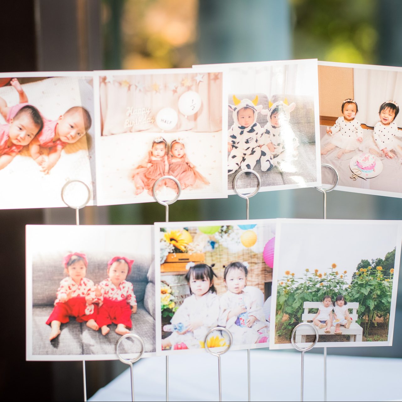 ウェルカムスペースに写真をたくさん飾り、披露宴会場での大画面スクリーンの動画や