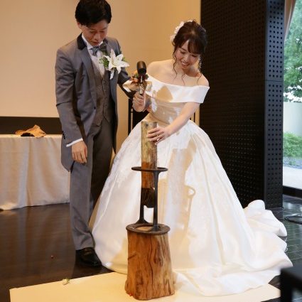 ケーキカットの代わりに私たちが考えたのが薪カットです。一風変わったことをやってゲストを楽しませたいという思いと、