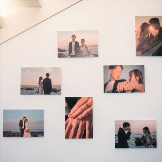 壁一面に前撮りで撮影したフォトパネルを飾りました。