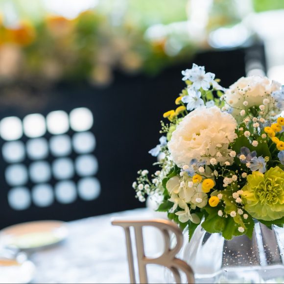 テーブルクロスや飾りつける花の色にこだわって爽やかな空間を作りました。