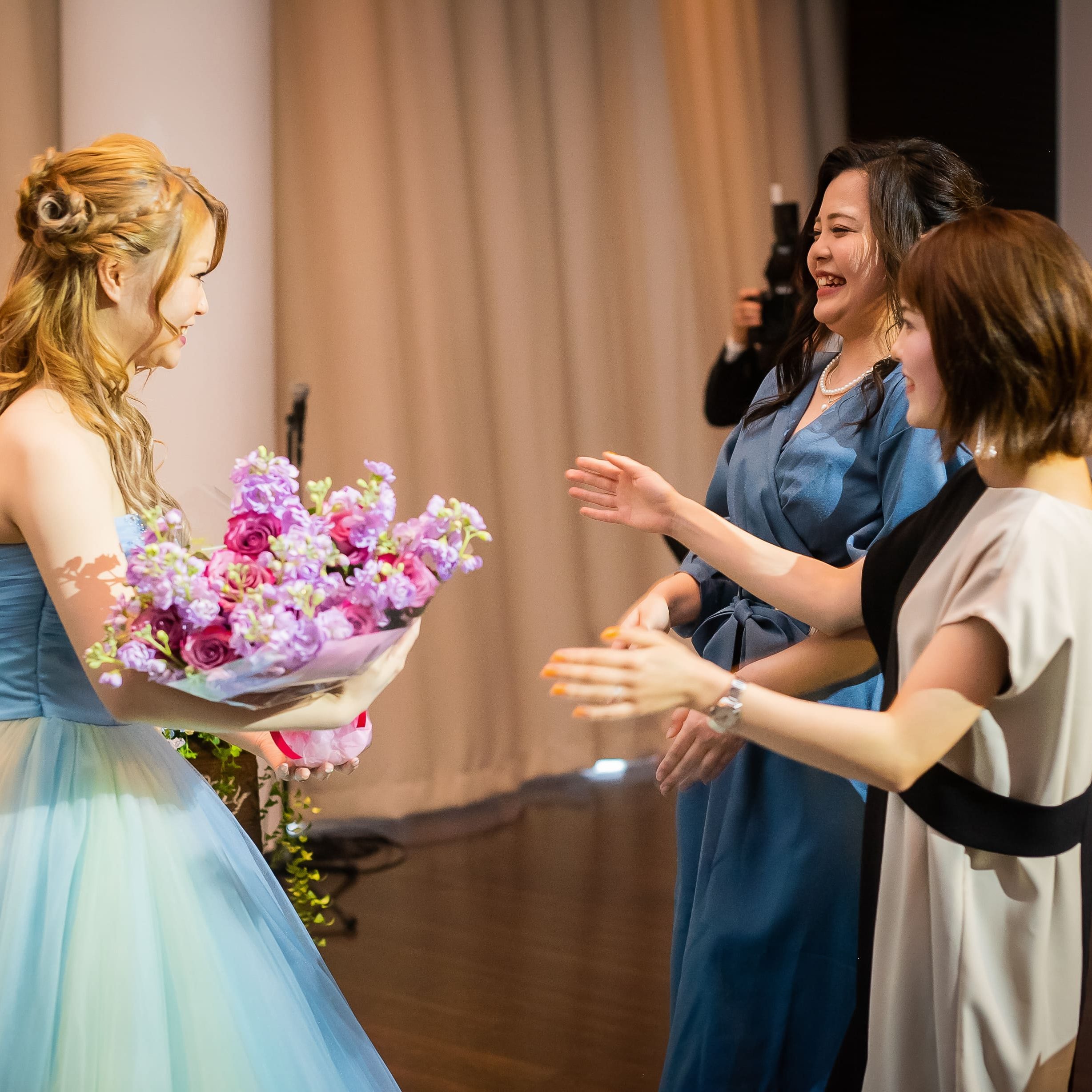 最後に両親への贈呈品を生まれた時と同じ重さのクマのぬいぐるみを渡したこと。私たちが結婚式を挙げられるのも両親がここまで育ててくれたおかげ、初心を忘れない気持ちと感謝の気持ちを込めて贈呈させていただきました。