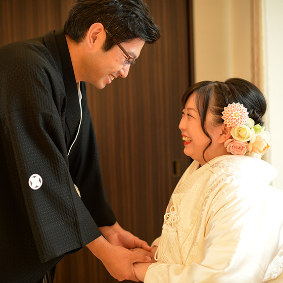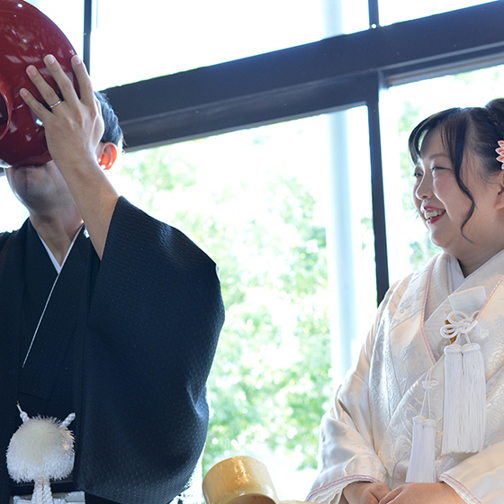 和やかな雰囲気の中、巫女の舞など本格的な神前式。式の途中で斎主から和菓子をプレゼントされるサプライズに、思わず笑顔がこぼれました。