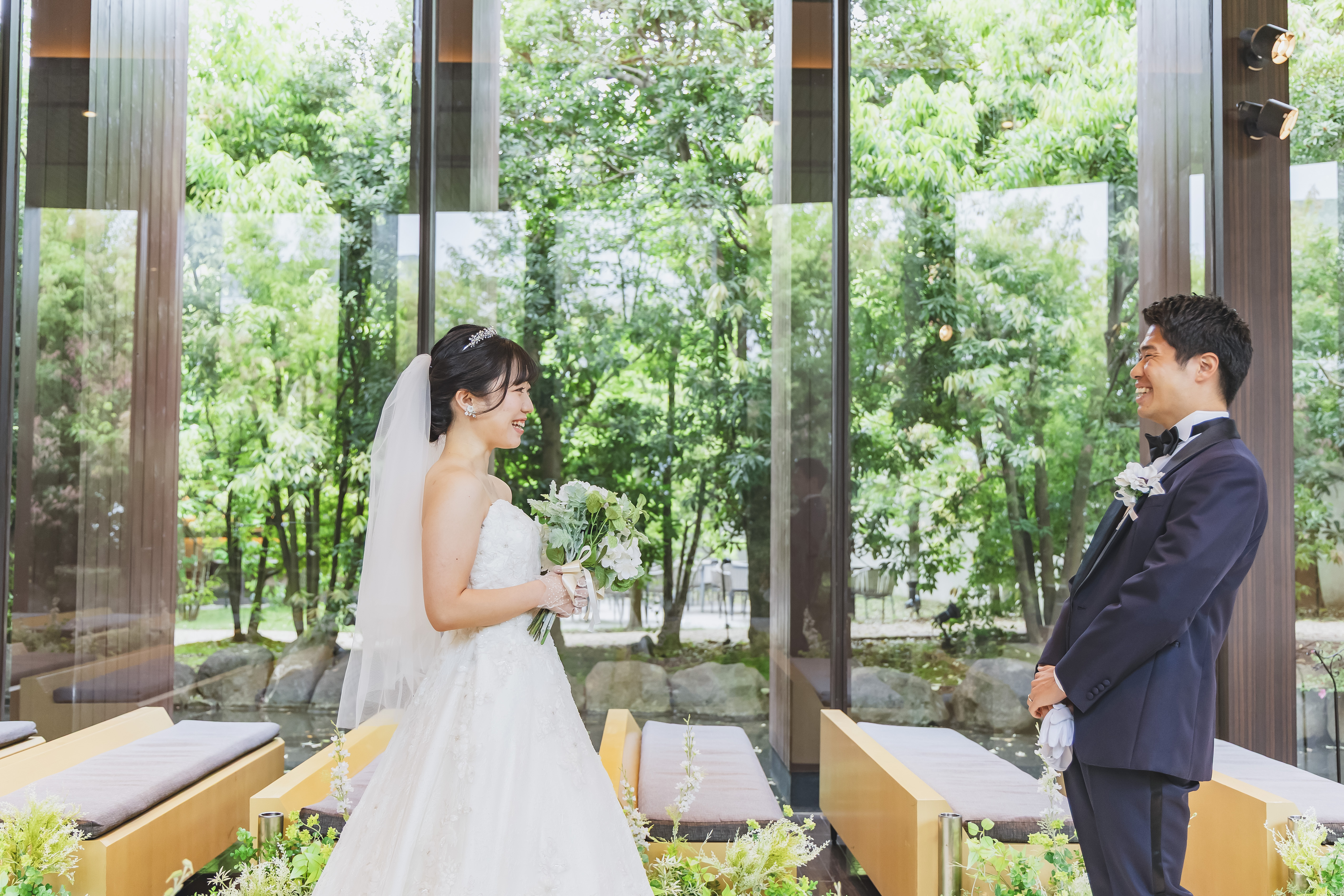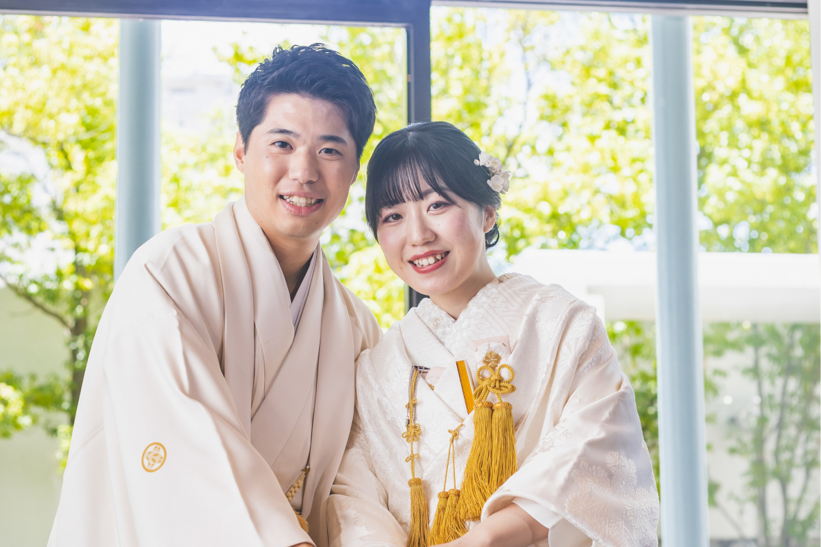 銀座ダイヤモンドシライシのスタッフの方からご紹介いただき、初めて見学にお越しいただきました。緑豊かな景色と自然光がたっぷり差し込むガラス張りの会場に魅力を感じていただき、麗風にてご結婚式を上げることをご決断いただきました。おふたりは少人数でのアットホームな式を希望していたため、人数に合わせたプランをご提案させていただきました。また、洋装だけでなく和装での挙式も可能という点にも魅力を感じていただき、おふたりらしいスタイルでの式をご提案させていただきました。自然と調和した開放的な空間と、自由度の高いプラン内容はまさにおふたりにぴったりだと思いました!