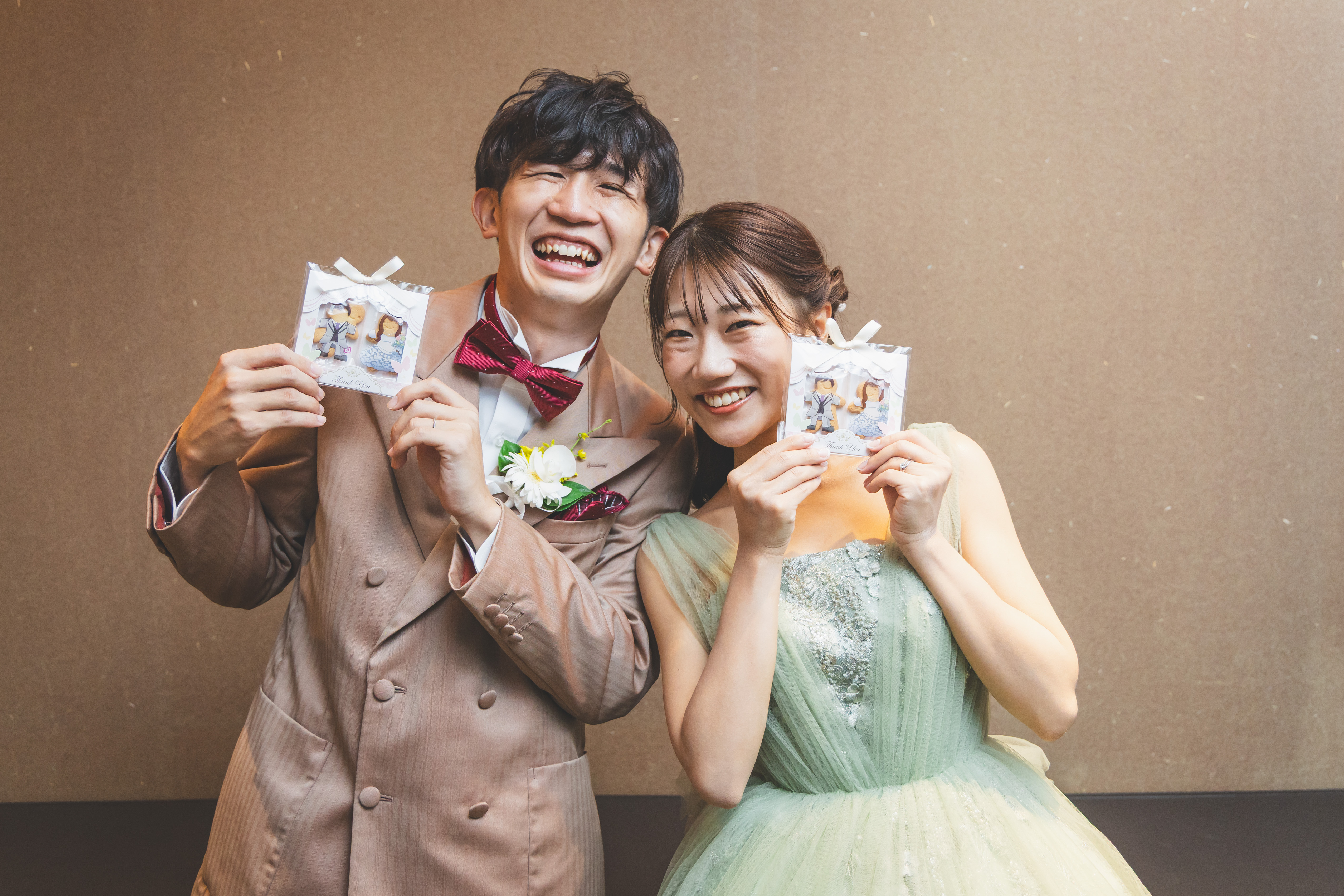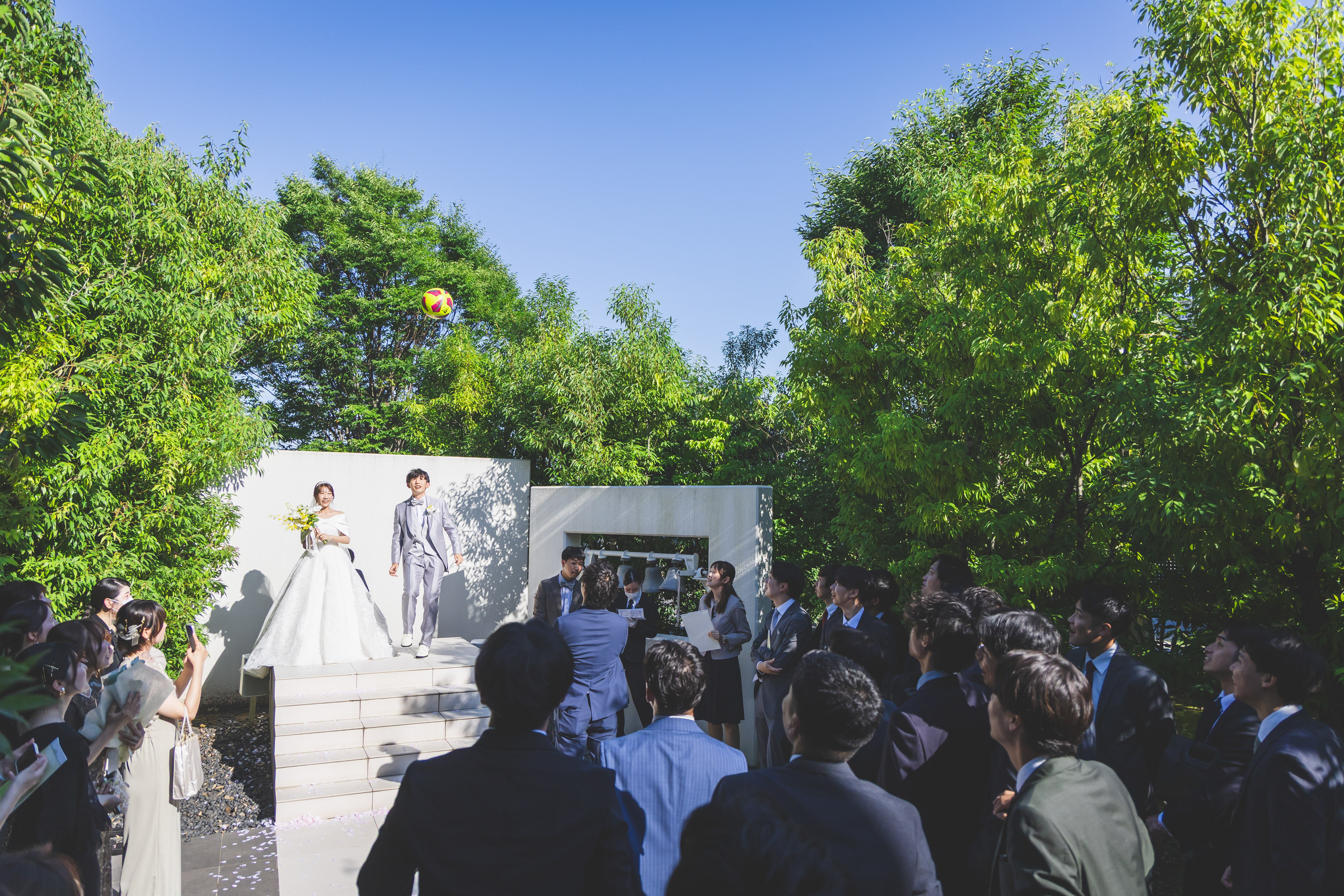 結婚式に参列してくれるゲストには全員ありのままにリラックスして楽しんでもらいたいと想いから、新郎のサッカーボールトスでキャッチした方には披露宴の料理のお肉をランクアップしたり、お色直しのドレス色当てクイズは正解だと思う色のペンライトを再入場に振ってもらいました。おふたりが想像していた以上に盛り上がり、たくさんの笑顔に包まれた光景となりました。おふたりにとっても忘れられない光景となりました。
