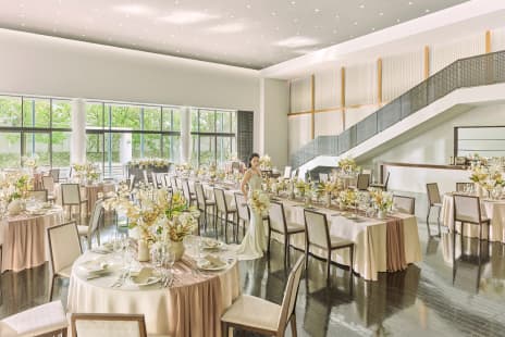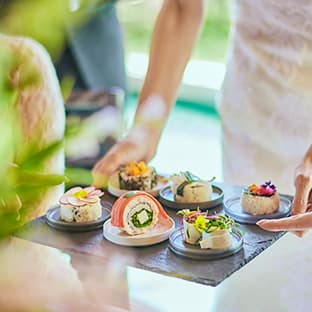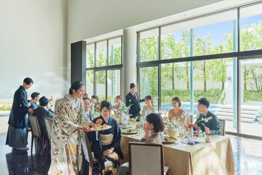 ラウンジやテラスを使ったカジュアルな空間で、少人数ウエディングにふさわしい時間をお過ごしください。ホームパーティーのような感覚で緊張が和らぎ、自然体でゲストとの会話を楽しめます。 お料理は、 地元の旬の食材を生かした”フレンチジャポネ”を、お食事の進み具合に合わせ、最も美味しい状態でお料理をご提供します。 完全バリアフリーにも対応しておりますので、お子さま連れやご年配のゲストにも安心してお過ごしいただけます。