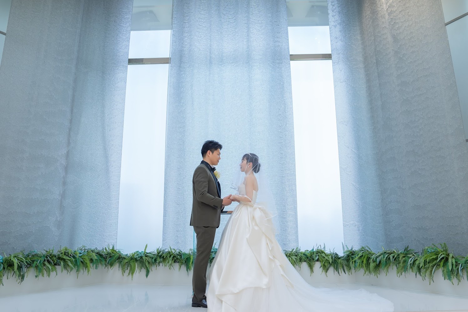 ウエディングドレスでの撮影はチャペルと大階段で行ったのですが、自然光が降り注ぐチャペルでの撮影は、流れる滝の水に光が反射してキラキラとした光がおふたりを包み込んでいて、とても感動しました。