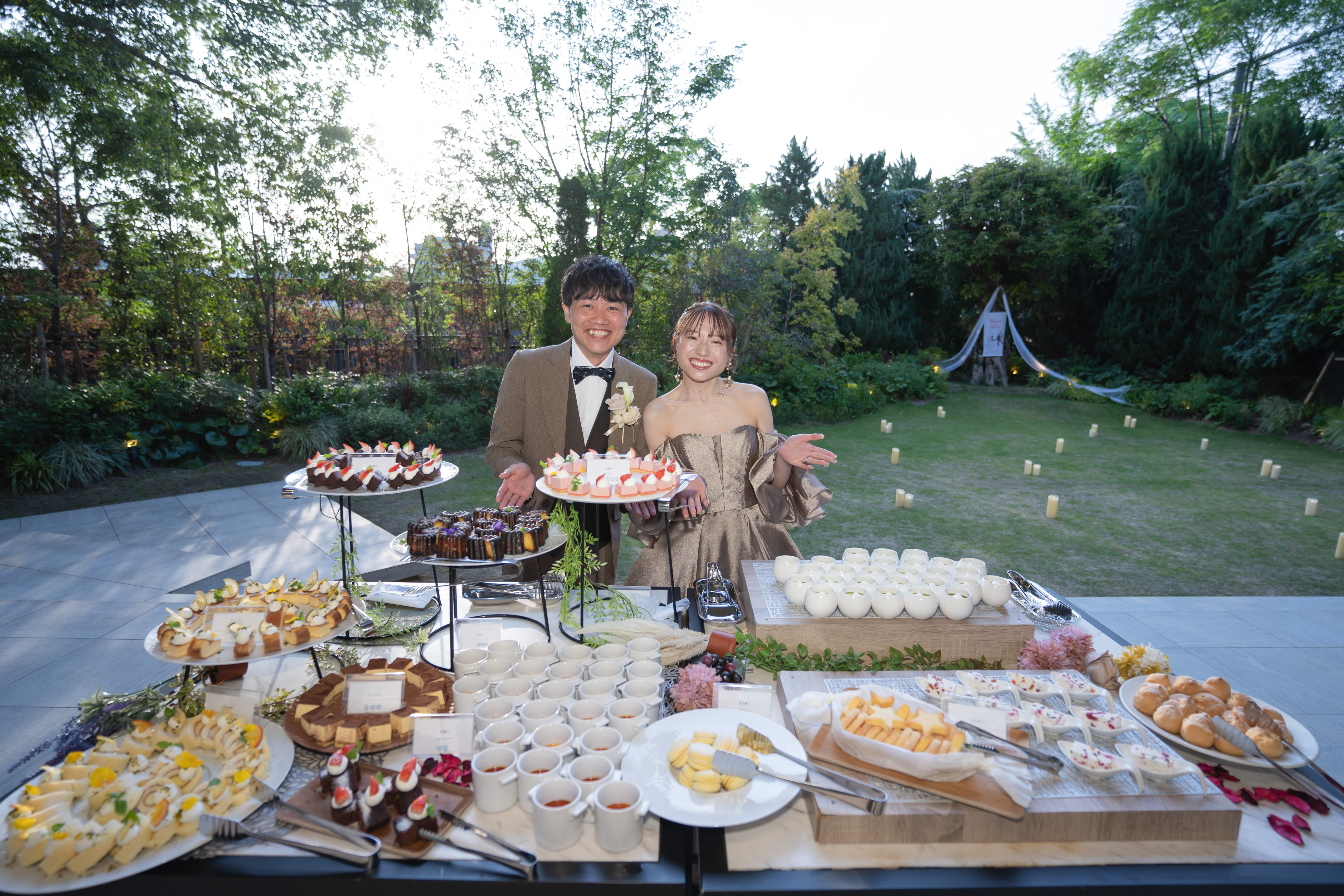 お打合せで一番のテーマになったのは、「ガーデンを最大限に活用すること」。 「外に出られる演出は、全部ガーデンでやりましょう!」と、ケーキ入刀、デザートブッフェ、フォトタイムに至るまで、セレモニーのすべてを青空の下で計画されました。