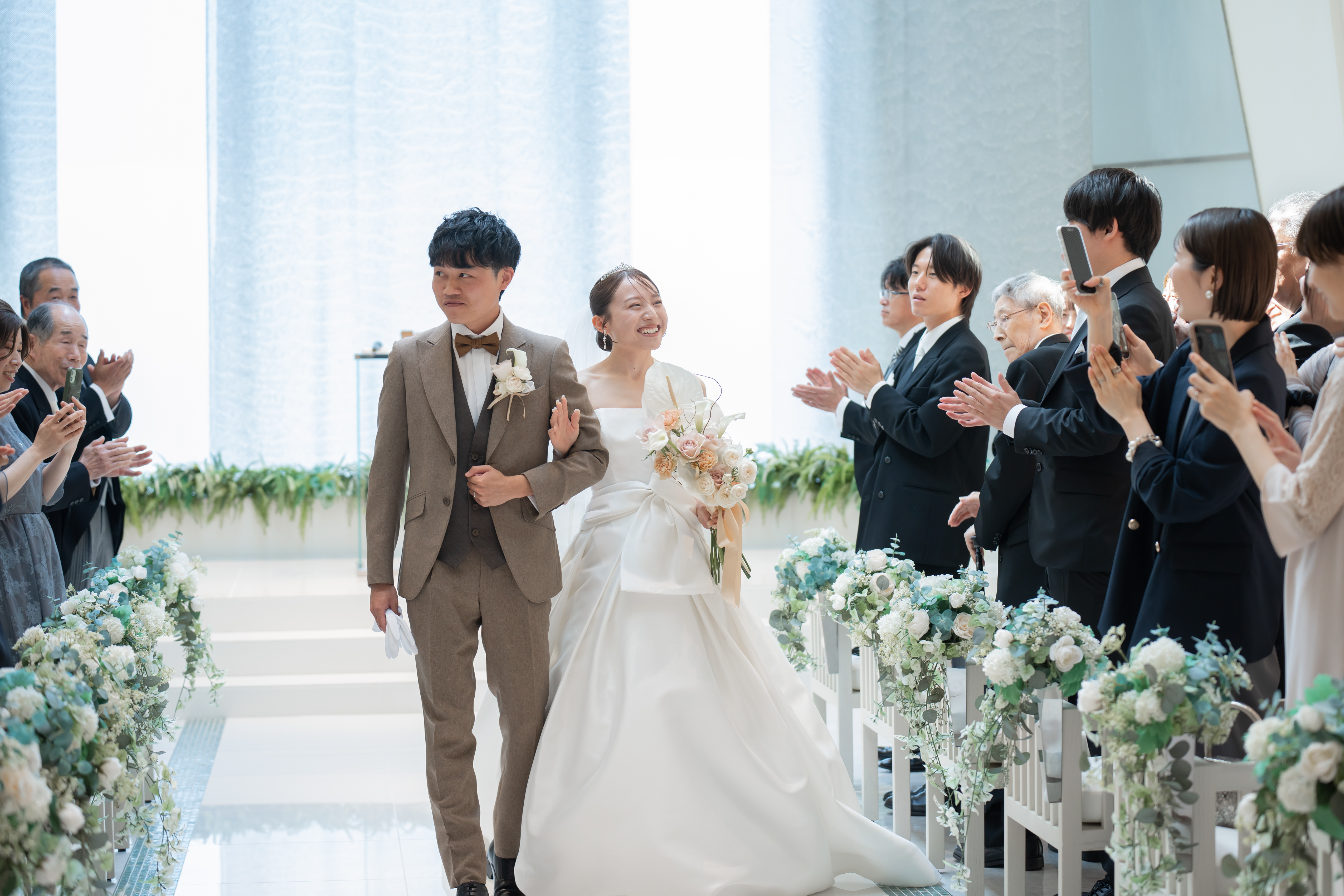 白を基調とした神秘的なチャペルの扉が開いた瞬間。真っ白なドレスに身を包み、緊張感と幸せが入り混じった表情で一歩を踏み出された新婦様の姿は、今も目に焼き付いています。