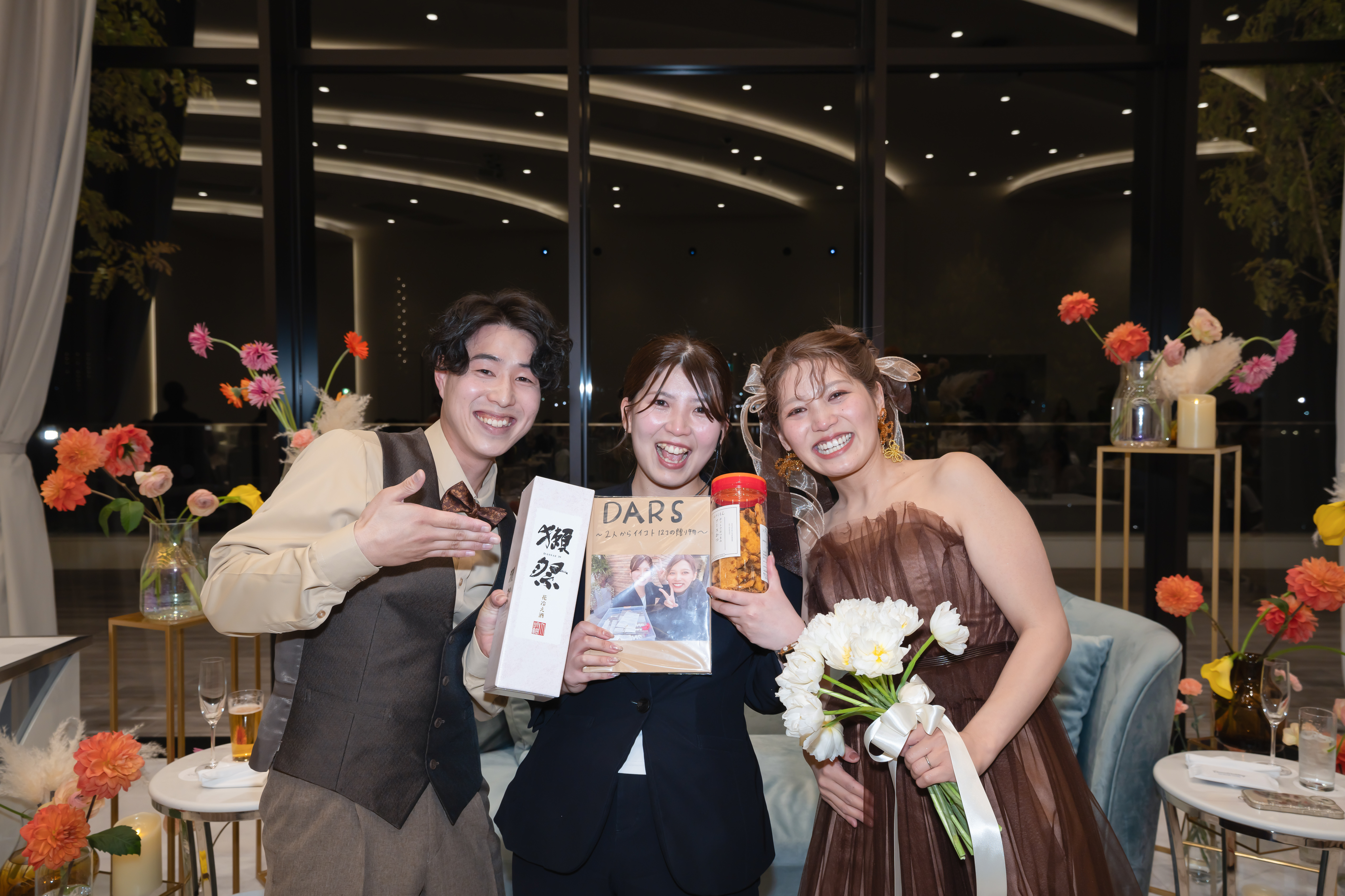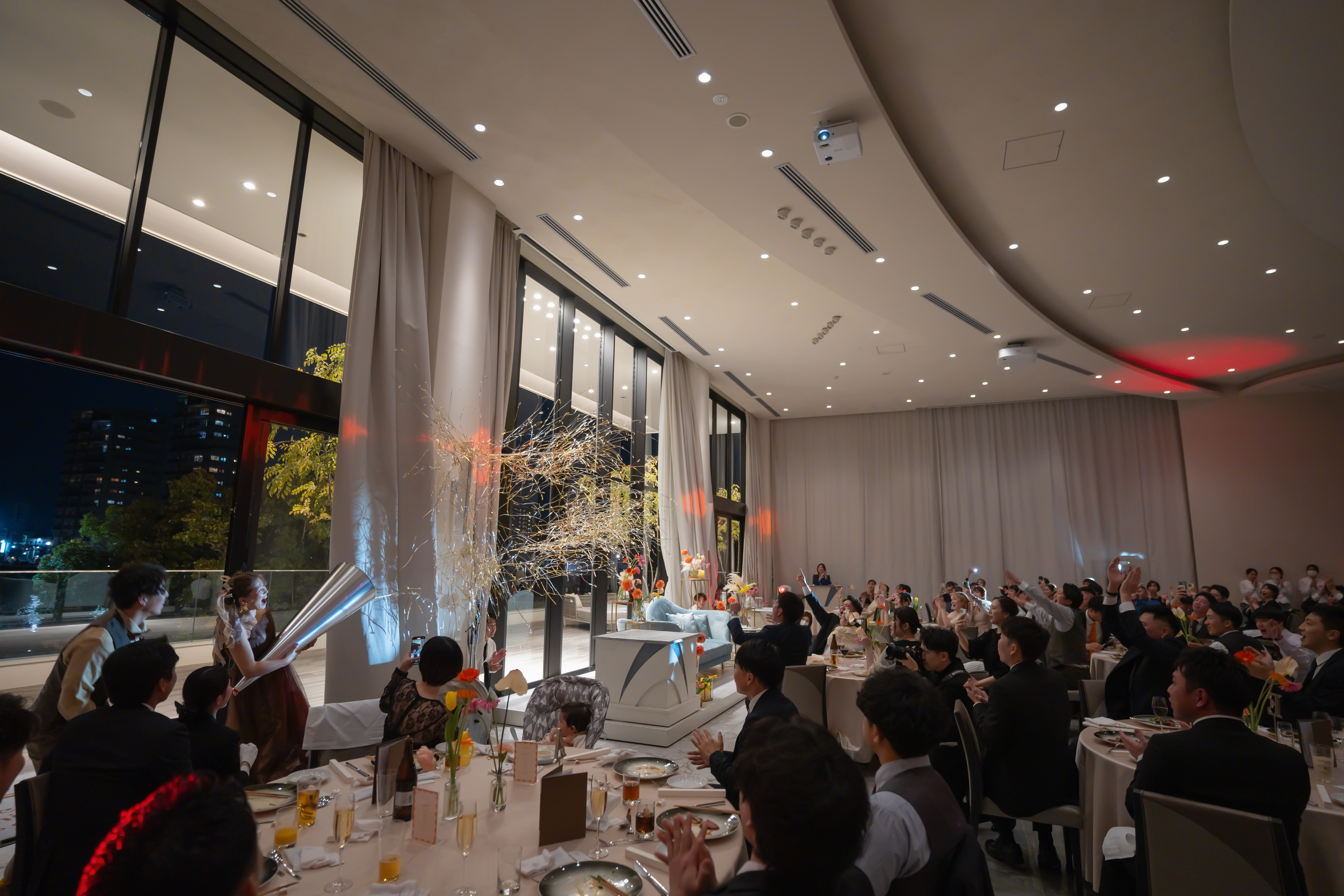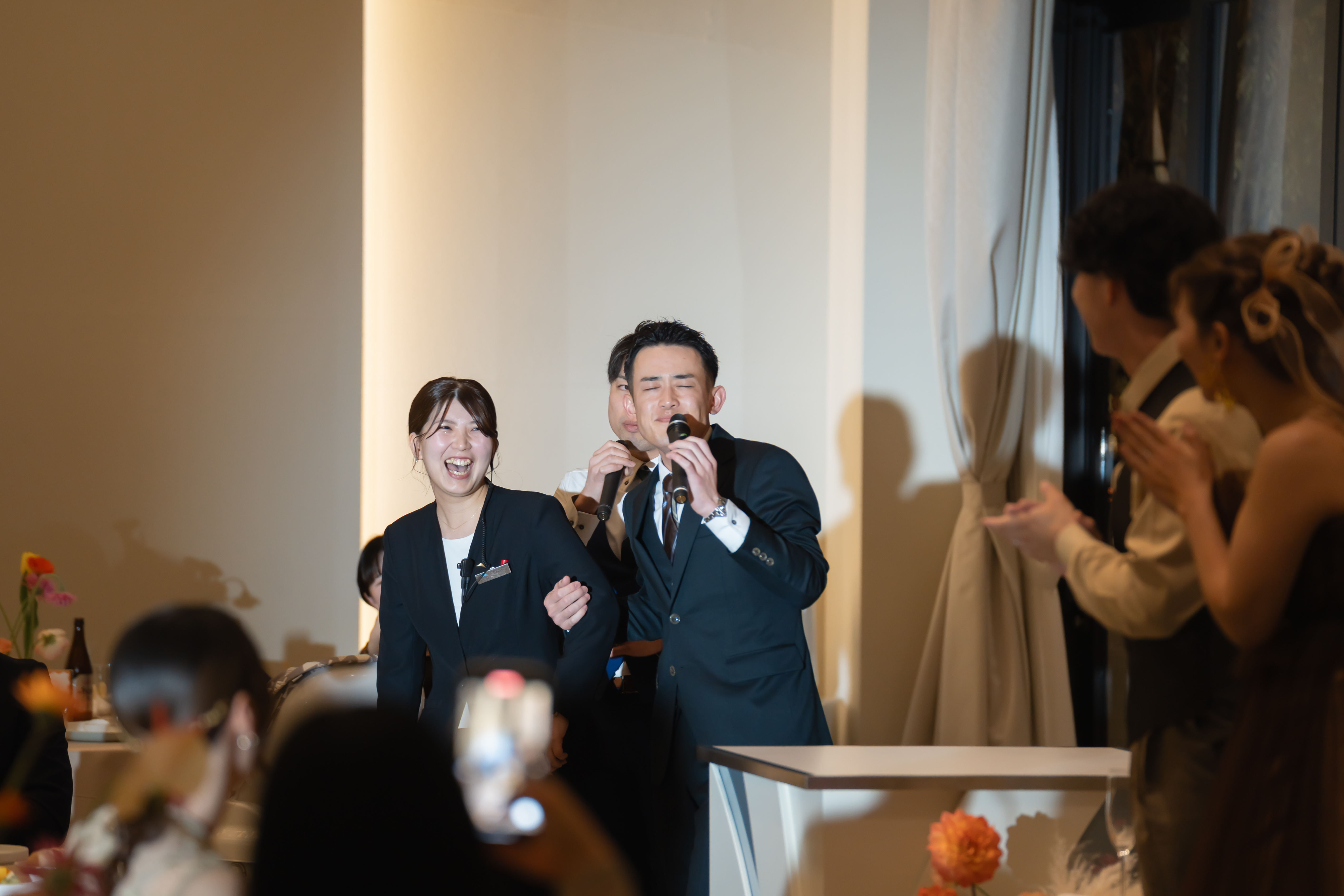 披露宴では、「最高に楽しい仕掛け」が待っていました。 歌自慢のご友人によるカラオケ余興と見せかけて、実はプロデューサーへのサプライズ!何も知らずに動画を回していた担当プロデューサーを巻き込み、会場のボルテージは最高潮に。友人でもある担当プロデューサーへ、感謝の手紙とこだわりの日本酒を贈られました。司会者のリードも相まって、会場内は感動と熱狂が入り混じった、まさに「おふたりが求めていた空気感」そのものでした。