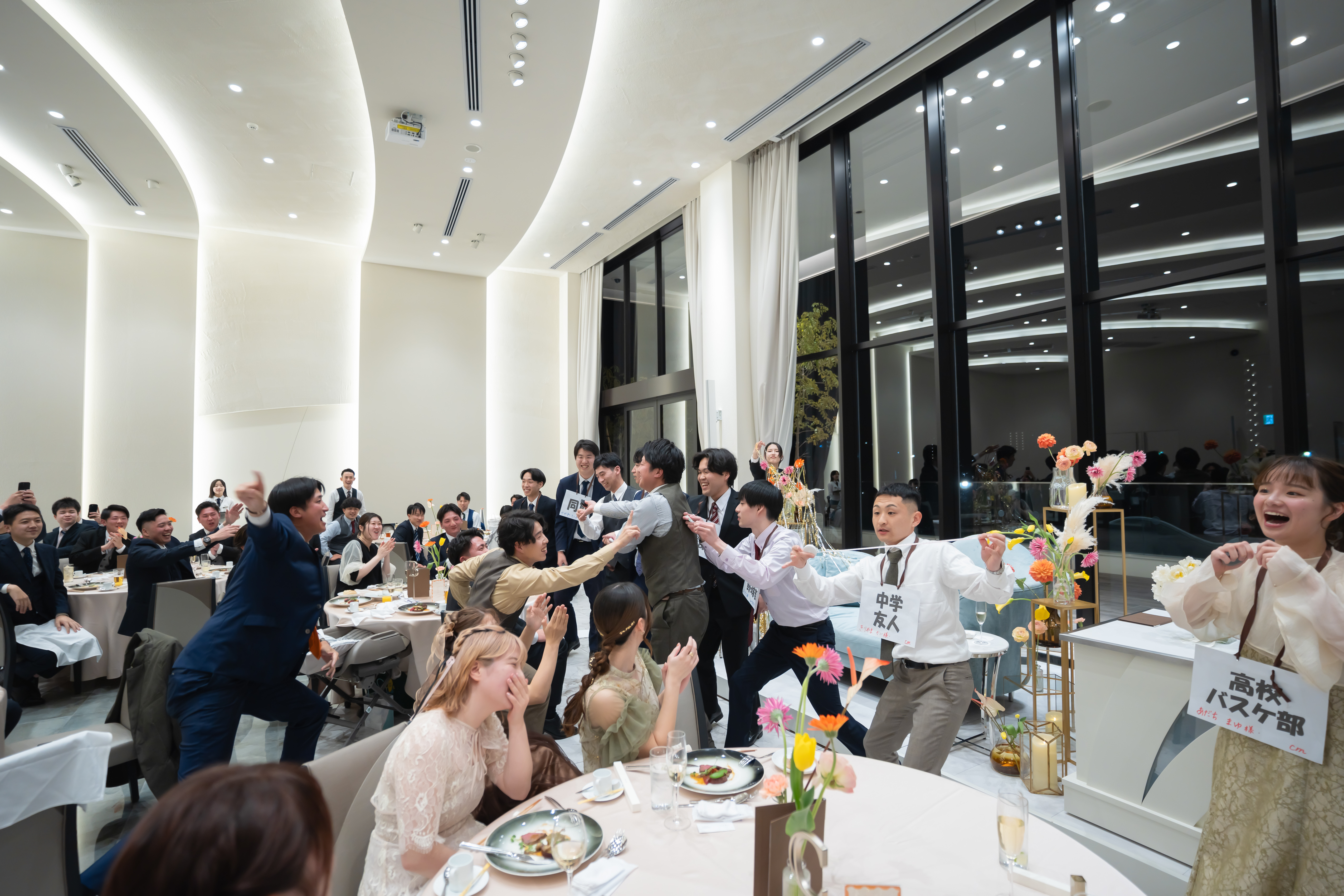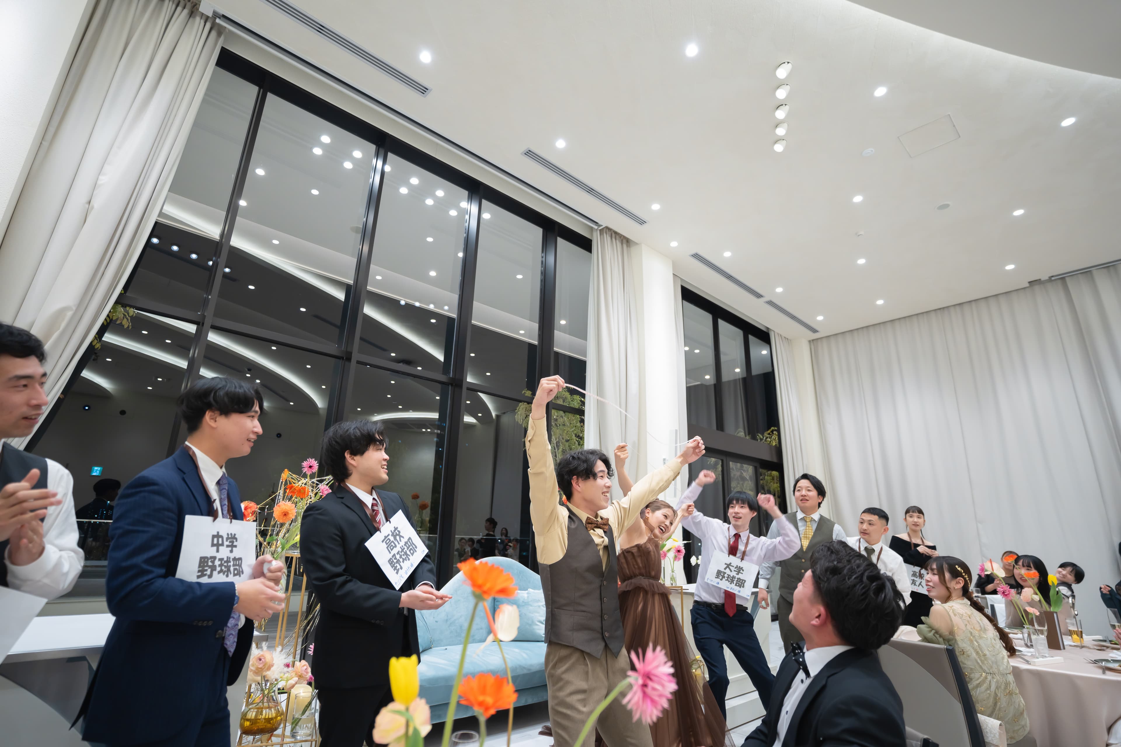 当日は、まさに笑いと涙の連続。 中学生時代の恩師と歩いた、光あふれるバージンロード。大好きなご友人と歩む中座の姿を、親御様や先生に見守っていただいた瞬間。そして新郎様が騎馬戦で駆け抜けた賑やかな中座! ご友人によるカラオケの余興や、会場全体が熱狂した「マツケンサンバゲーム」、さらには心温まるサプライズまで……。