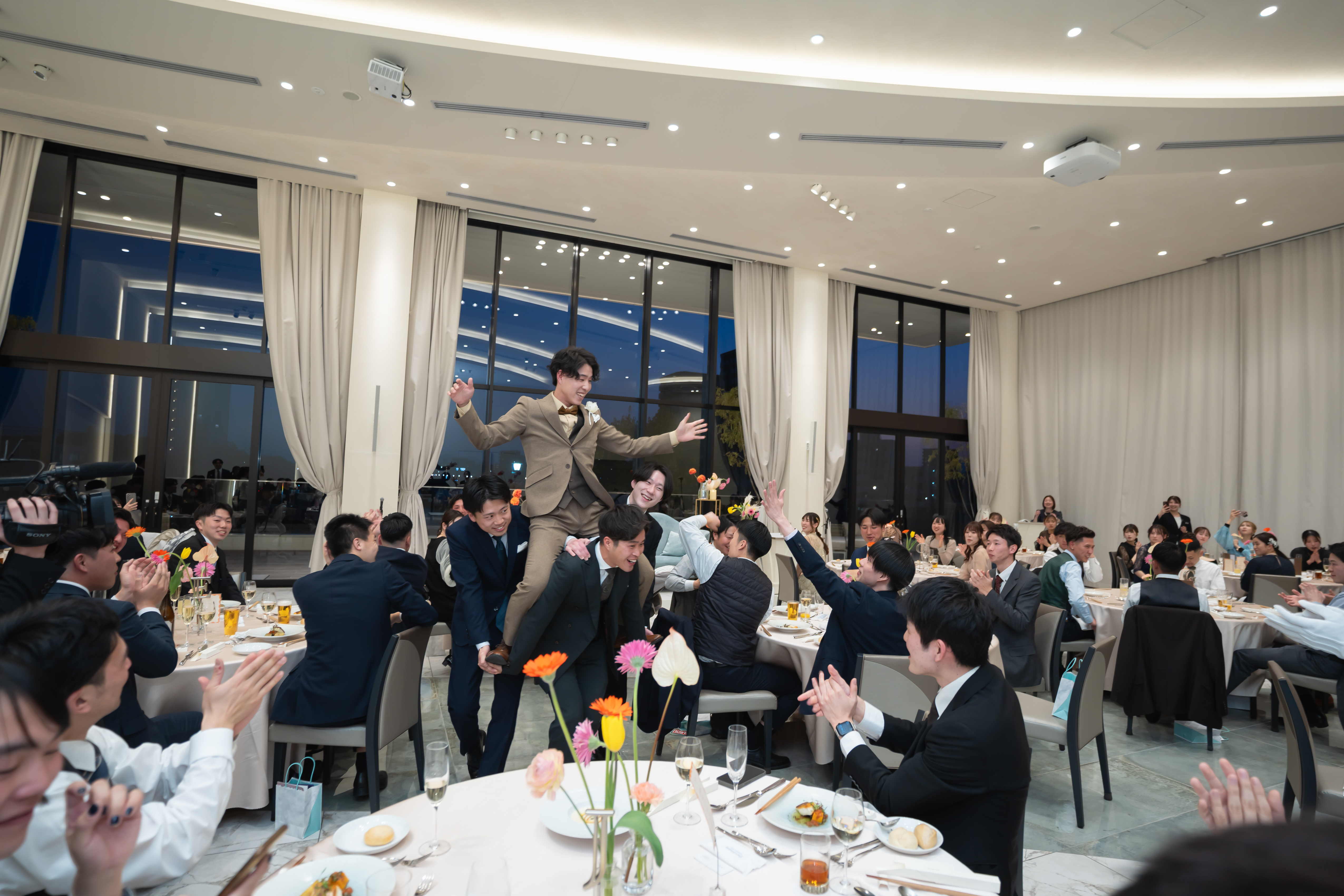 その後も、新郎様の騎馬戦中座や、プロデューサーも一緒に知恵を絞って作り上げた「マツケンサンバゲーム」など、一瞬たりとも目が離せない演出が続きました。 「準備は大変だったけれど、やって良かった!」と笑い合うおふたりの姿を見て、私たちも「この場所を選んでいただけて、本当に良かった」と胸がいっぱいになりました。