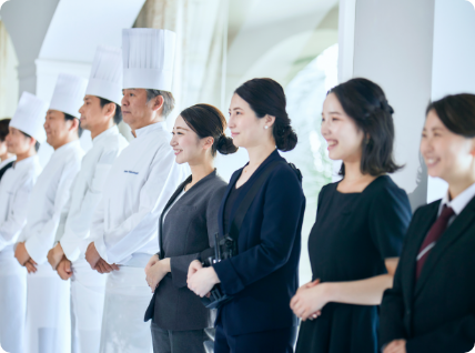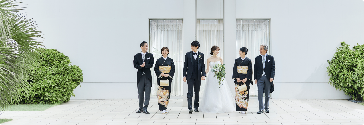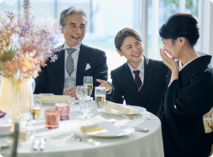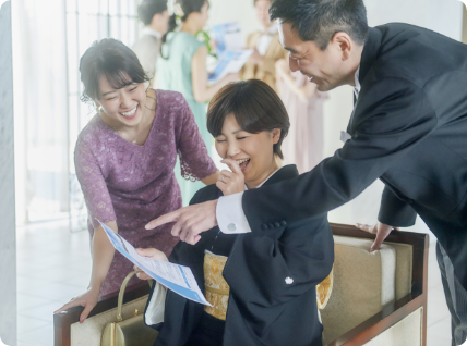 ご家族のみなさまにも、リラックスしておふたりのSmileを楽しんでほしい。そんな想いからうまれた専属のファミリーコンシェルジュ。式服の着付けやご挨拶のタイミングといった進行面においてもご安心いただけるようサポートいたします。