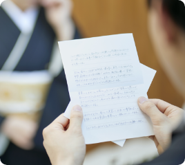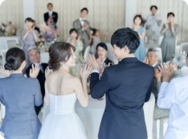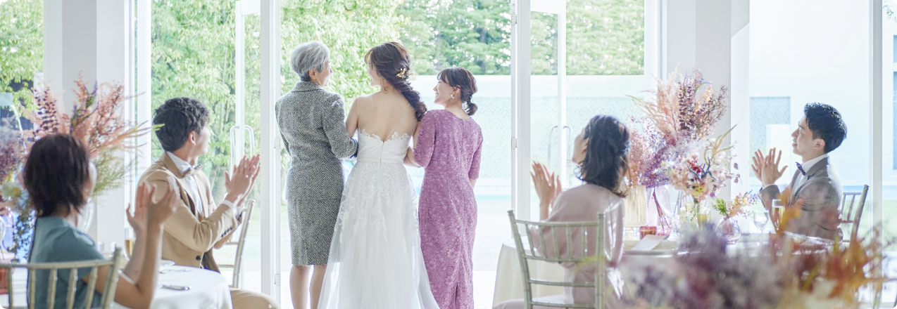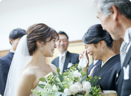 おふたりのしあわせを、誰よりも願う親御様に。お支度を整えた新郎様、新婦様のお姿を、いちばん最初にご覧いただくひととき。いままで大切に育んでくださった親御様への感謝の気持ちを、ご自身のお言葉でお伝えいただきます。