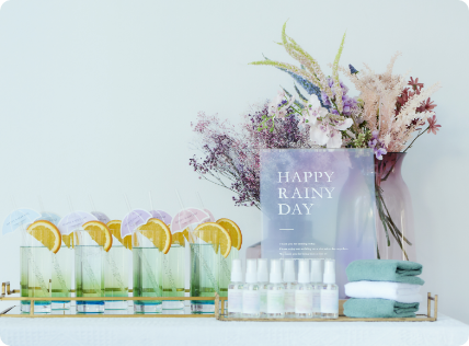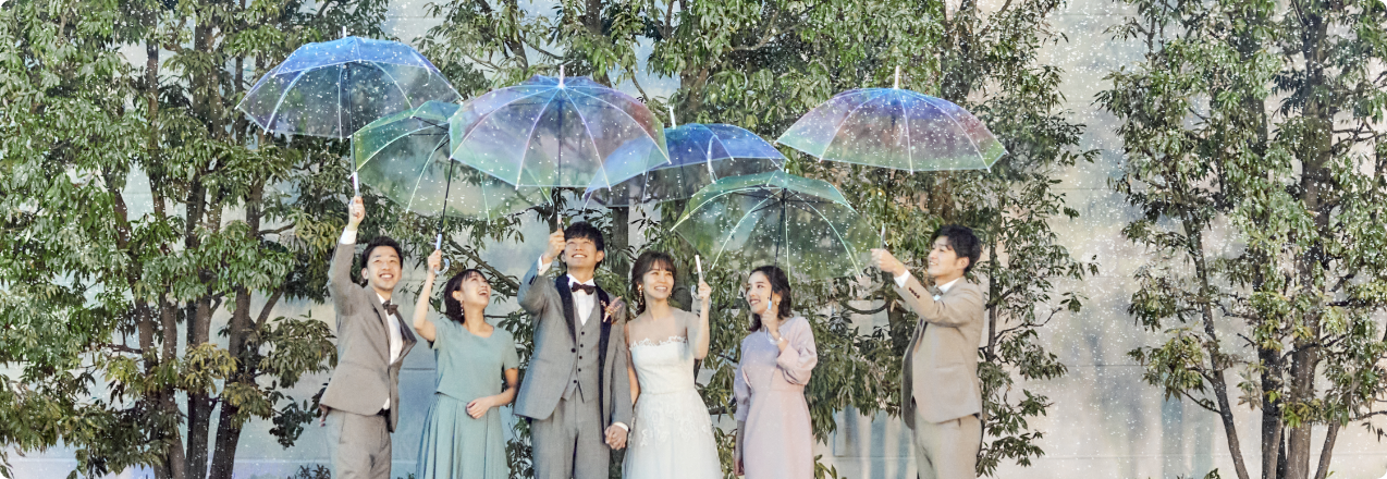 「結婚式に降る雨は幸運をもたらす」という言い伝えがあります。だからこそ、とっておきのおもてなしで、雨の日ごと思い出にのこしましょう。タオルや防水スプレーなどもご用意いたしますので、ゲストのみなさまにもご安心いただけます。