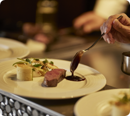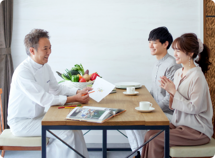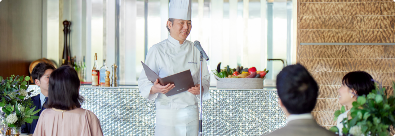 シェフとのお打合せを重ねて考える、唯一無二のコースメニュー。ゲストのみなさまに美味しいお料理をお召し上がりいただくことは、感謝の気持ちを伝えることでもあります。その想いに寄り添い、おふたりらしいお料理をご提案いたします。