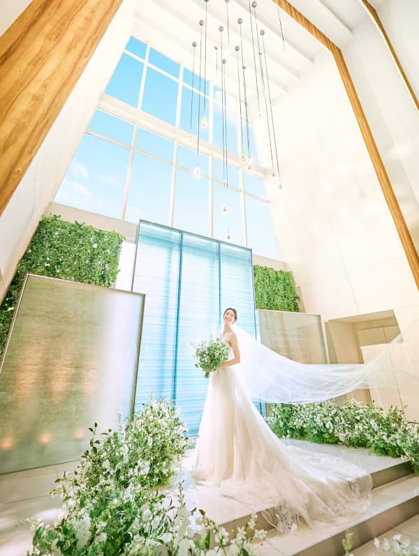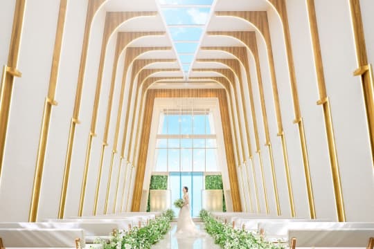 一筋の光という意味のチャペル「Ray(レイ)」。 天窓から降り注ぐやさしい自然光、光のアーチを表現したデザイン。ここにしかない開放感抜群の特別なステージで、心に残る印象的なセレモニーが叶います。