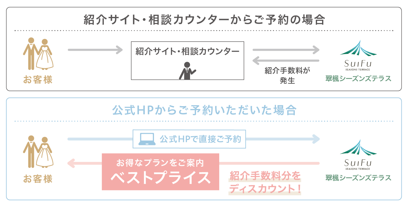 式場紹介・相談カウンターからのご予約や式場比較サイトからのご予約に比べて、当公式HPでご予約いただくと仲介手数料がかからないため、お客様に100%還元したプランをご案内することができます。