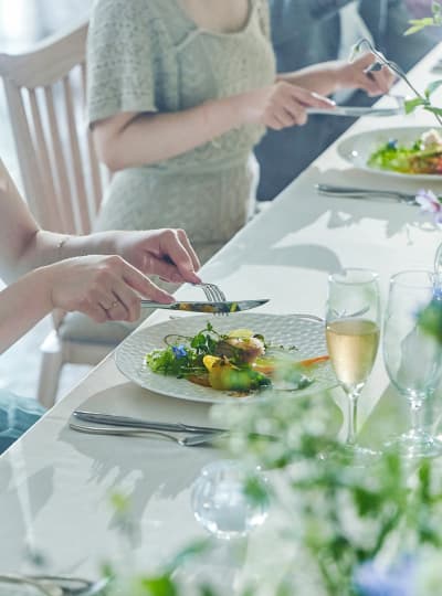 少人数だからこそ、ゲストと近い距離でゆったり過ごせるパーティーのお時間。出来立てのお料理と上質な空間が更に華を添えます。