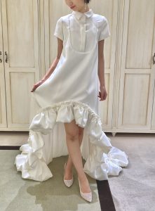 座った際も流れるようなバルーンフリルでドラマティックなワンシ