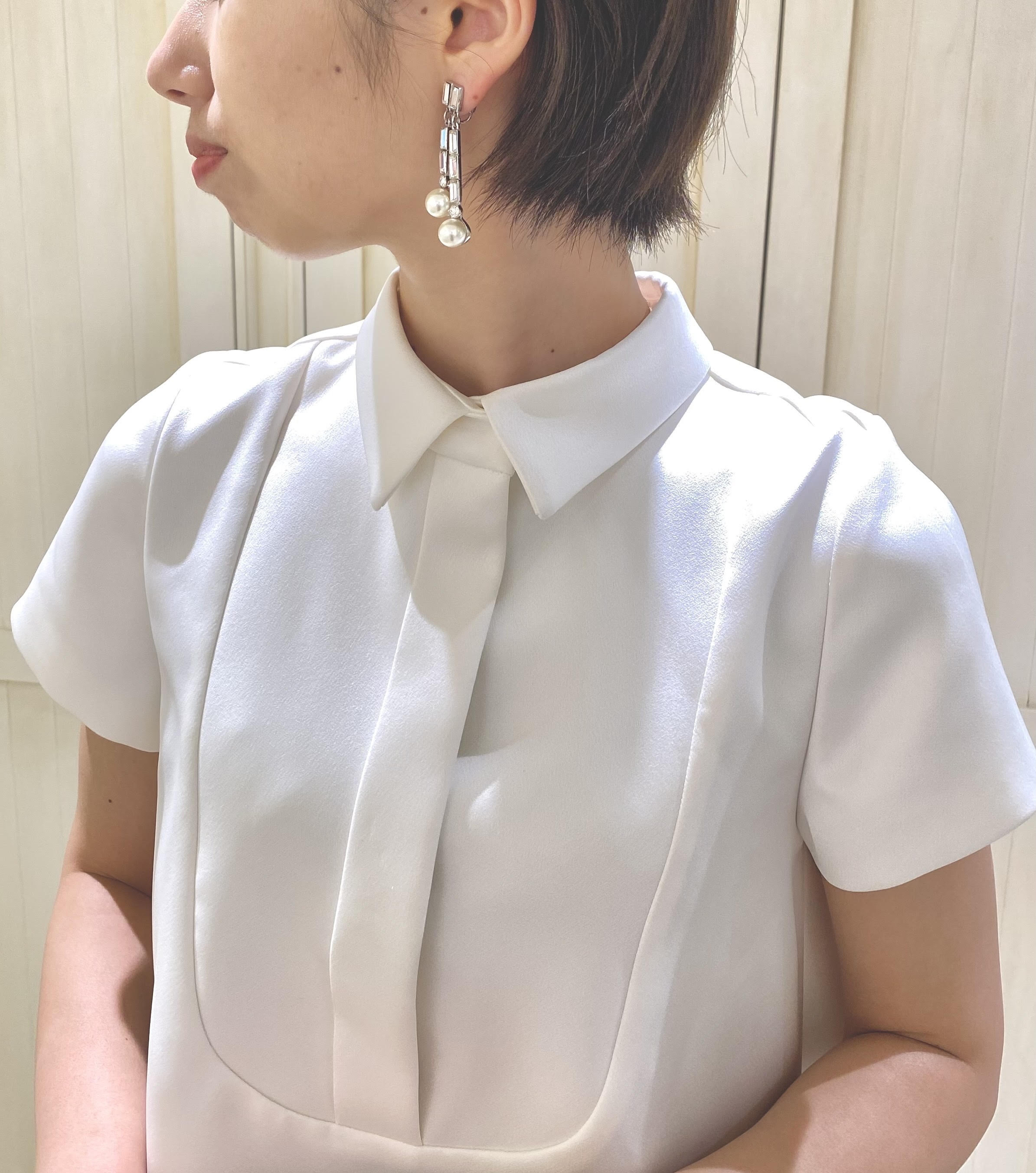 小ぶりな衿のついたシャツデザインはマニッシュなスタイリングも