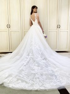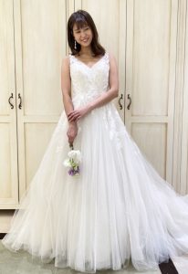 トレーンは裾元にかけて広がるセンターレースで圧巻のバックスタイルを叶えます。
