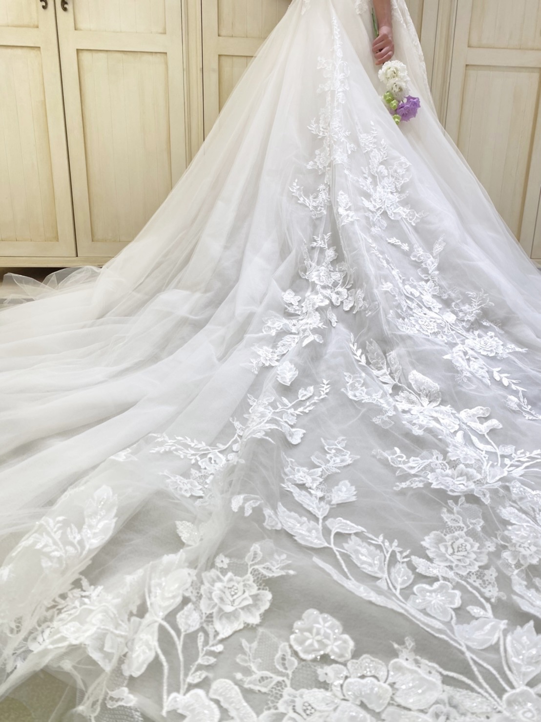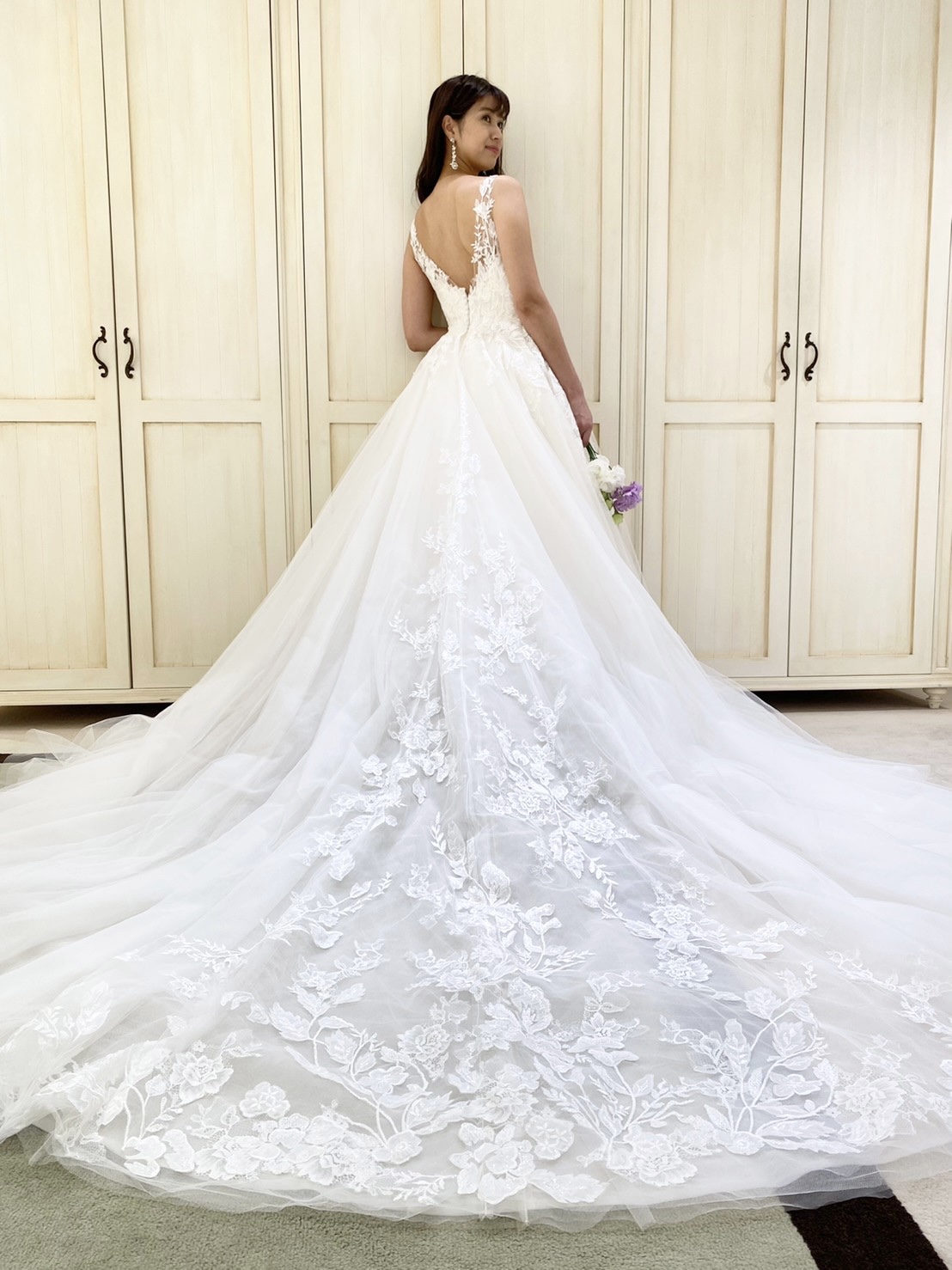 トレーンは裾元にかけて広がるセンターレースで圧巻のバックスタイルを叶えます。