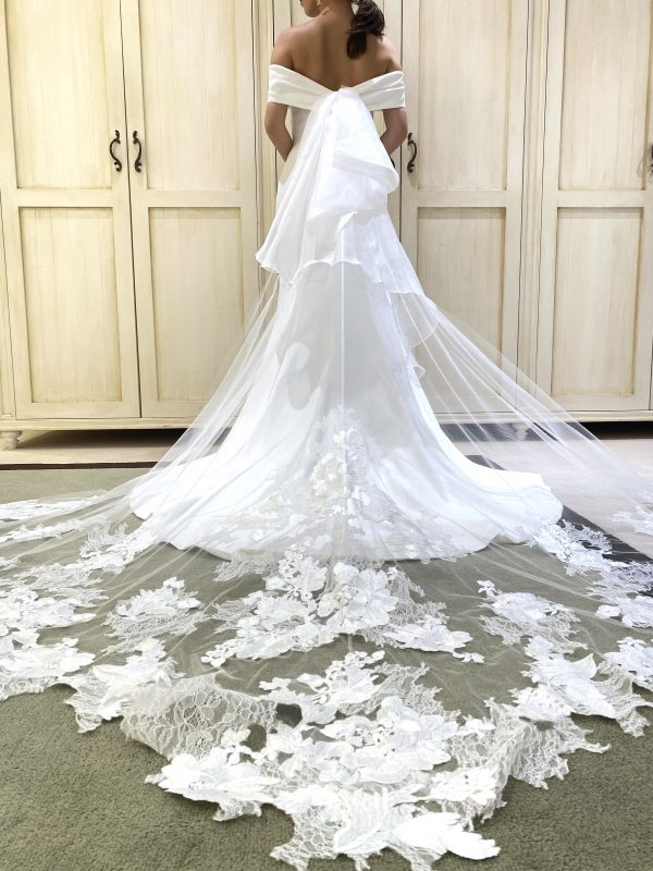 トレーンは、レースと刺繍が重なり奥行きがあり