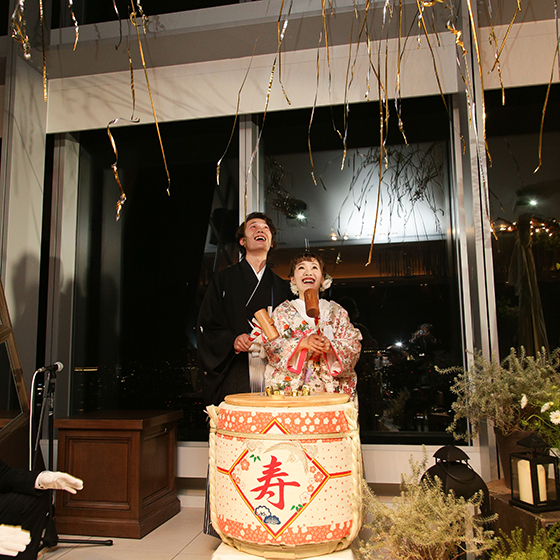 新郎・新婦が樽のふたを割ります。大きい声であればあるほど、運が舞い込んでくると言われているので、