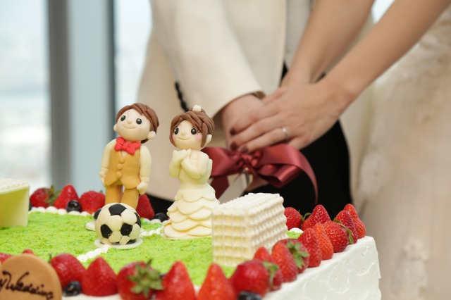 サッカーフィールドをイメージしたケーキに、「ふたりらしい!」と盛り上がりました。