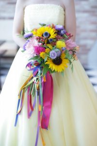 合わせたブーケは夏の代表、ひまわりとカラフルリボン。