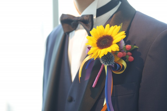 合わせたブーケは夏の代表、ひまわりとカラフルリボン。