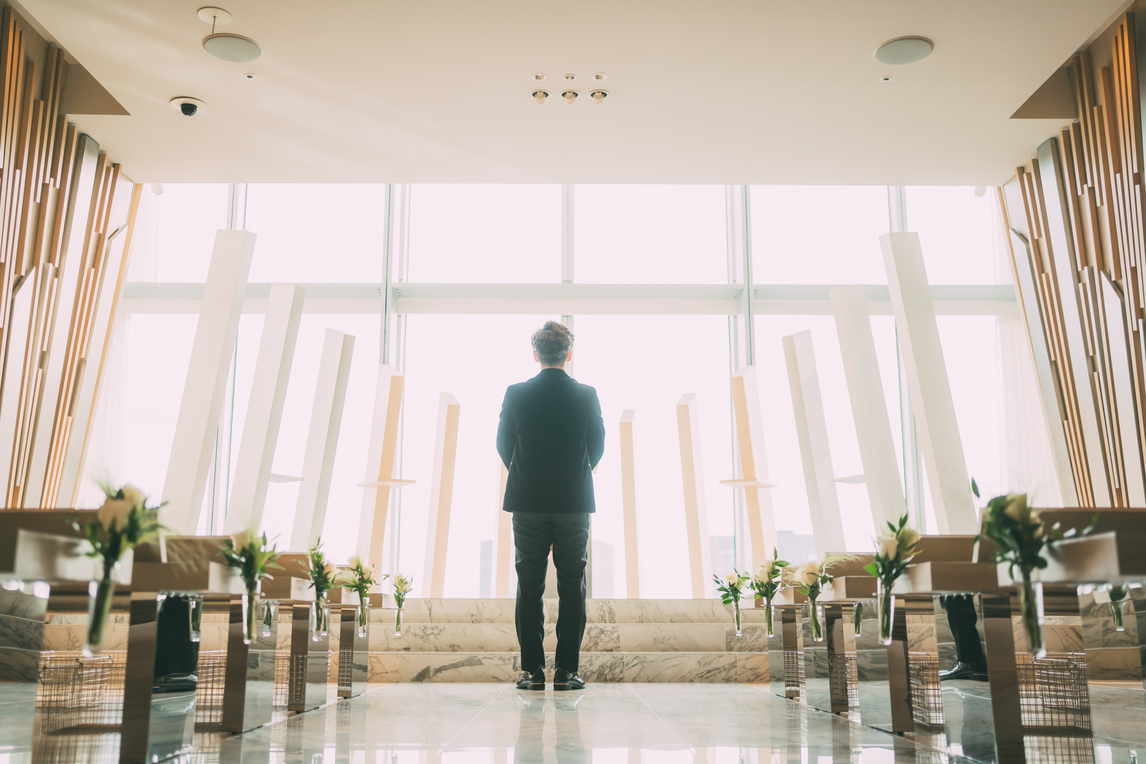 おふたりのお支度がアップして、チャペルにてファーストミートの準備をしている新郎様