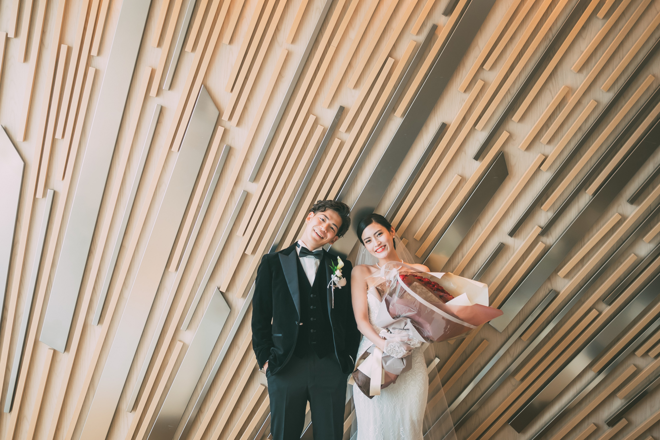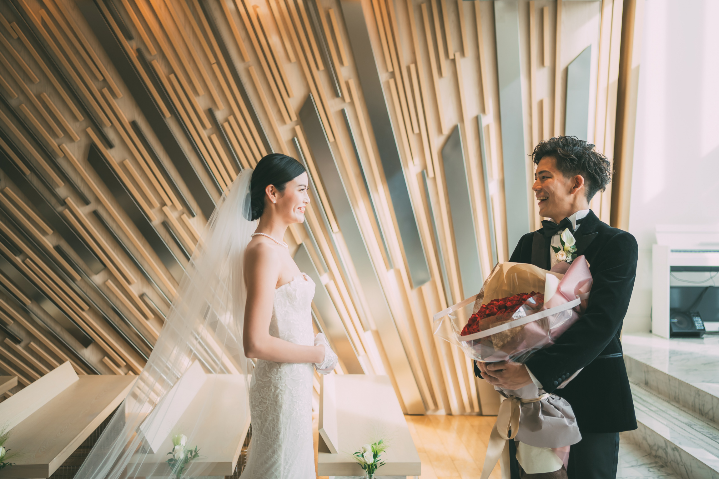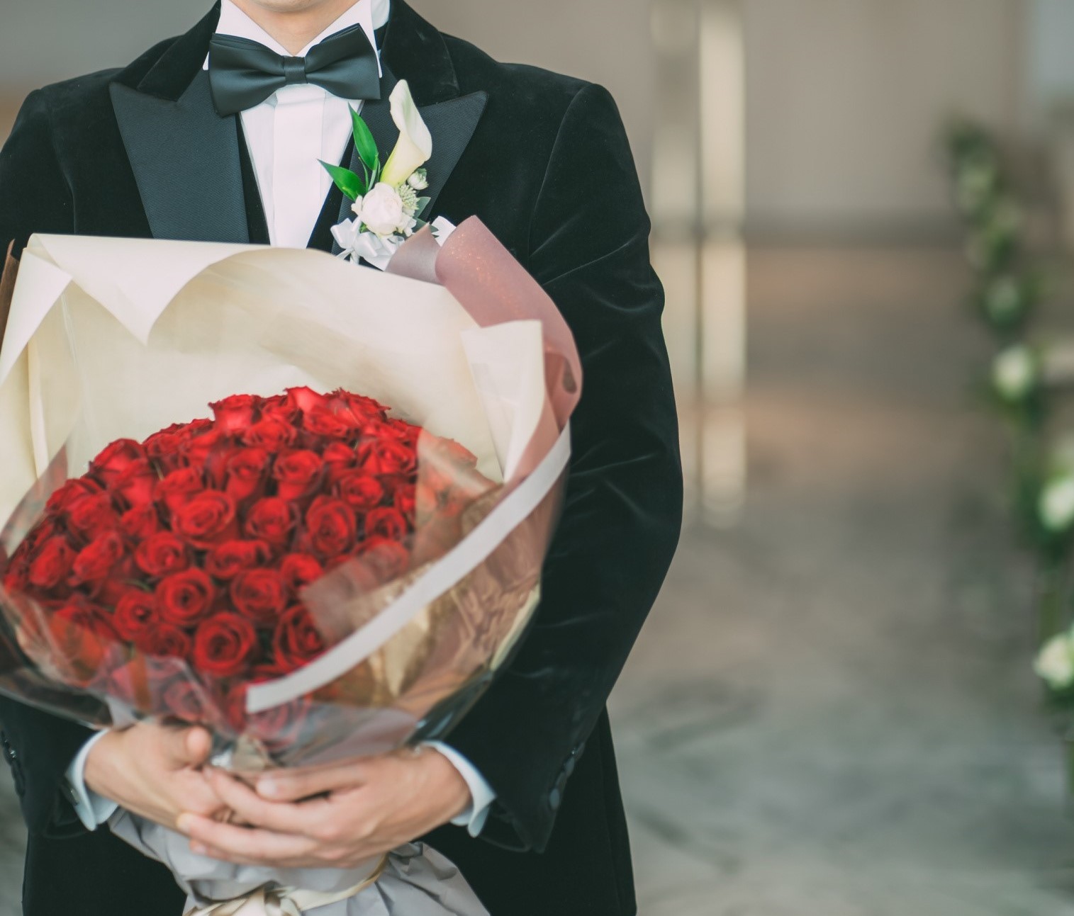 新郎様のお手元には真っ赤なバラの花束が!