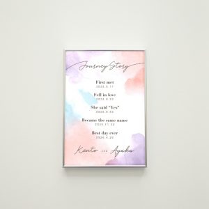 カリグラフィーでおふたりの記念日を記したラブストーリーボード。出会った日・付き合った日・プロポーズ日・結婚式日とおふたりのお名前を入れることができます。新居のインテリアにもおすすめです♩