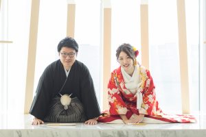 和装の定番は、二人で並んで正座をしたりお辞儀をしたり。
