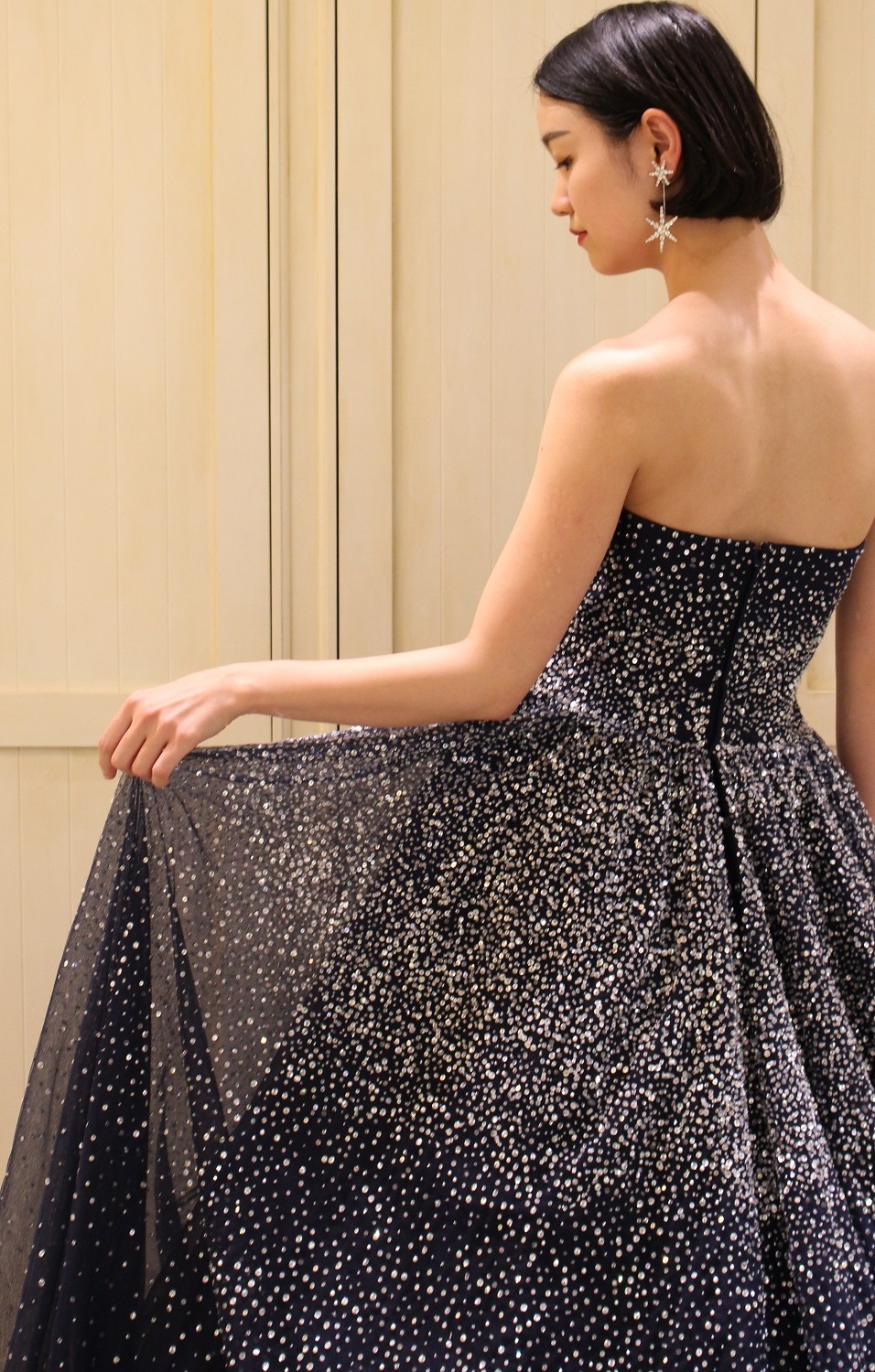 ドレス全体にスパンコールが散りばめられており、 繊細な輝きが魅力なドレス。