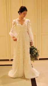 立体的なフラワーモチーフに繊細な刺繍が目を引くロングスリーブのドレスです。
