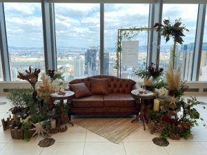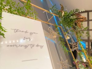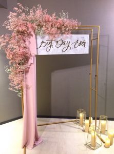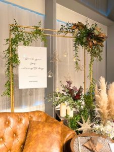 また先日のスマイルでは会場装花に合わせたドライフラワーやゴールドの小物と共に飾り、ソファ席のメインバック装飾としてコーディネートしました!