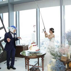 ゲストの皆様から思わず笑顔が溢れるウエディングケーキのセレモニーは、釣竿を使っておこないました!